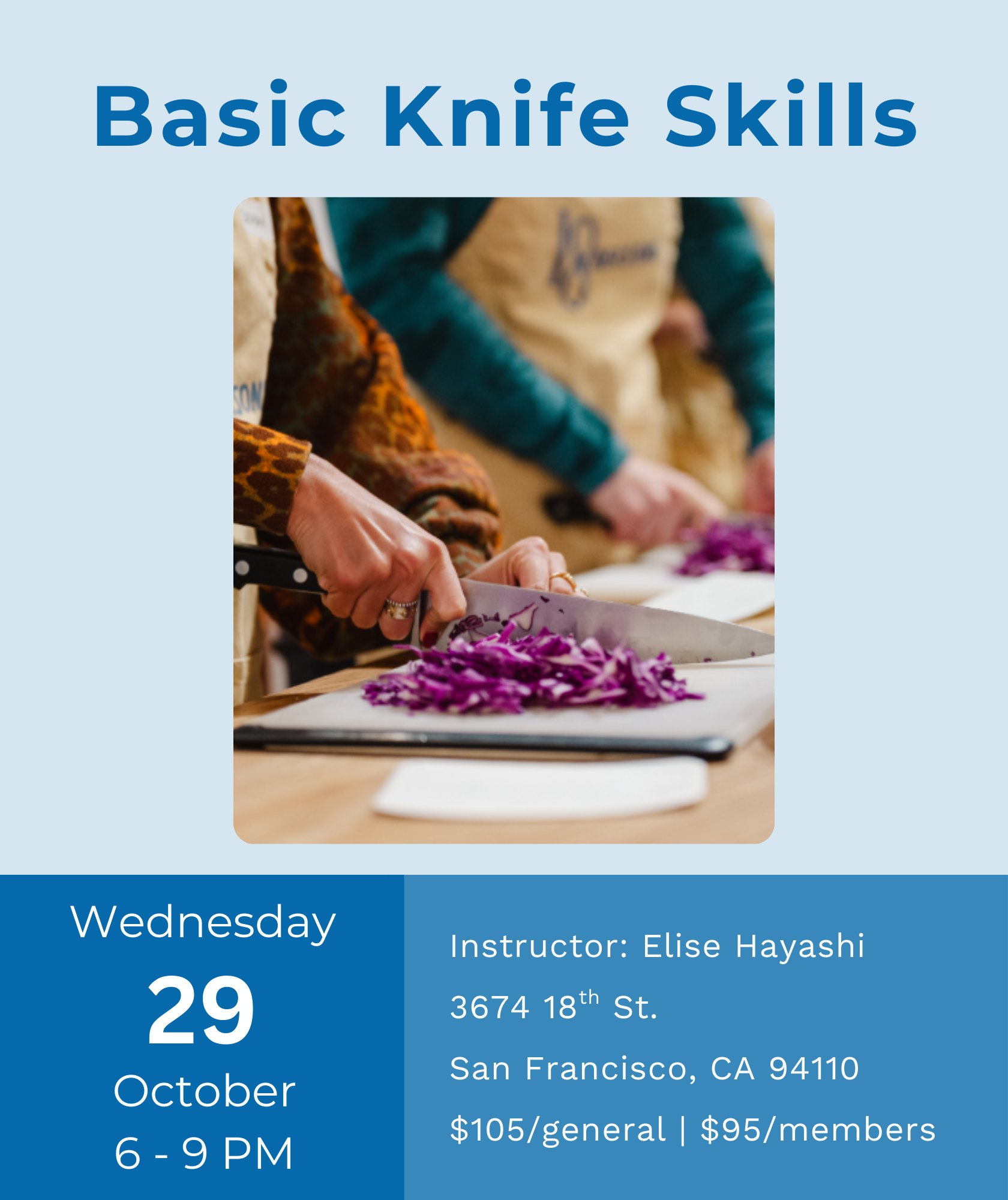 Join Chef Elise Hayashi for a class in the basics of using your chef's knife at home. We will discuss the ins and outs of knife use, care and safety. You will walk away knowing how to maintain a sharp edge and the best way to cut vegetables and herbs. This is a great class for beginners.