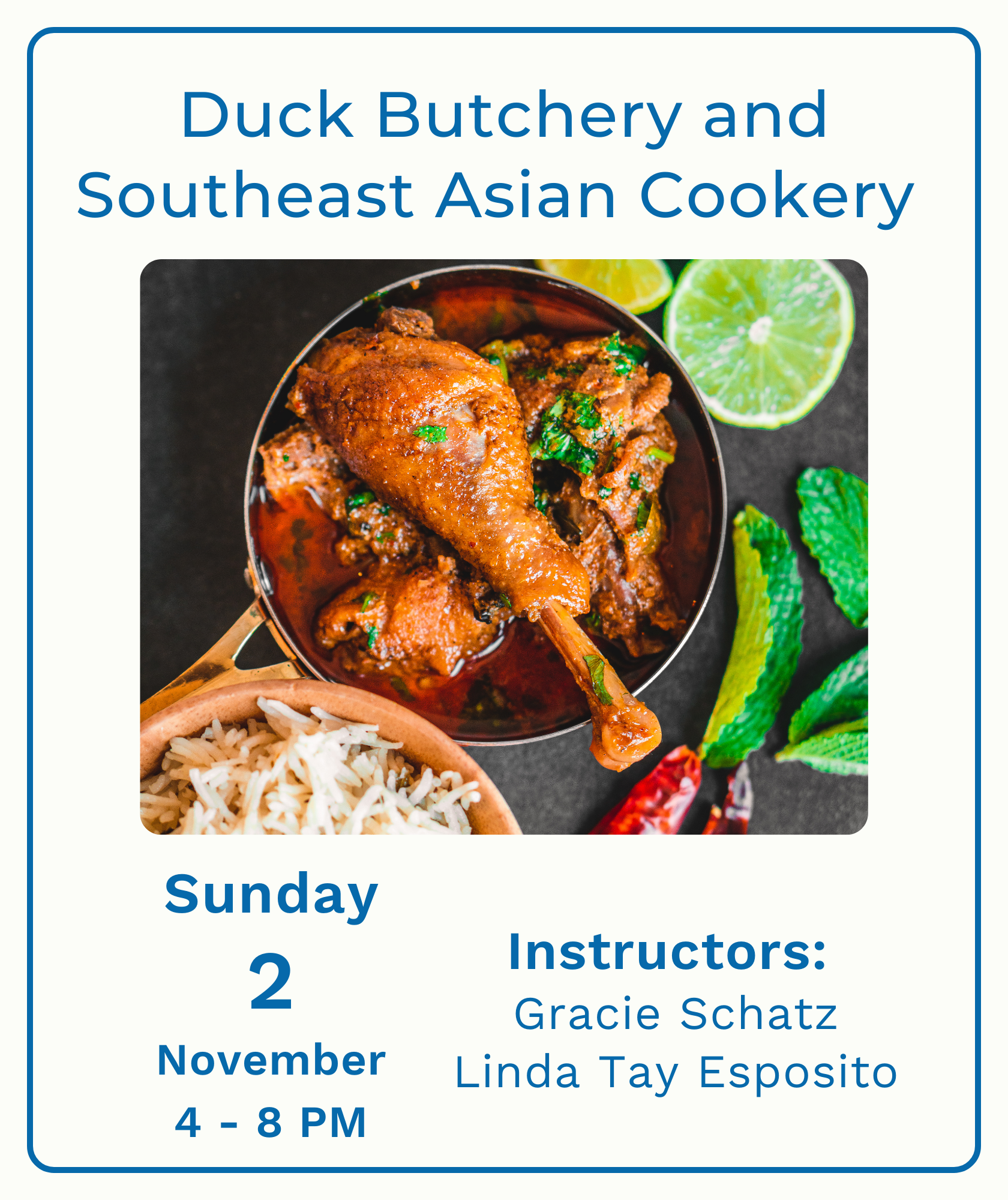 This dynamic duo is back! Our head chef and butcher, Gracie, will lead students through whole duck butchery, and will teach you how to efficiently and carefully break apart this delicious bird. Then, our resident Malaysian and South East Asian chef, Linda, will show students how to cook each piece of duck to optimize flavor, tenderness and beauty! If you love to order duck at restaurants but have struggled to make it shine at home, this class is for you. Get ready to level up your butchery skills and gain a deeper understanding of this tasty bird!