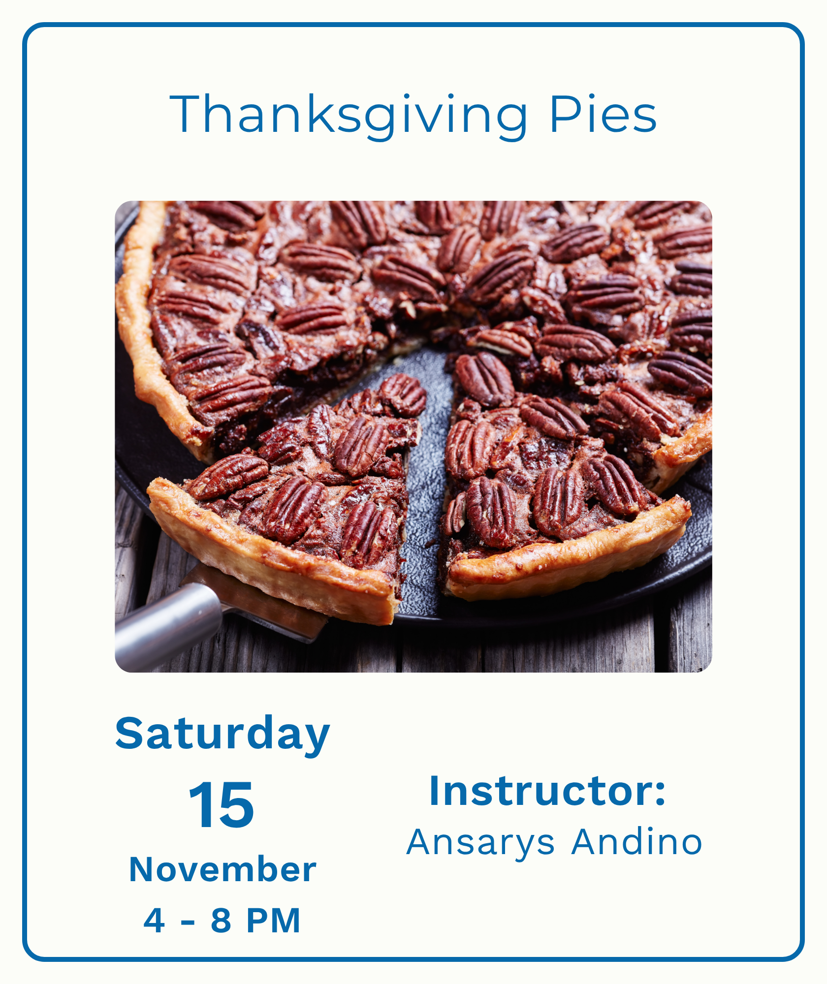 Join us for a hands-on Thanksgiving pie class where you'll learn to bake three stunning holiday pies from scratch! For those who embrace traditional crowd pleasers, we’ll learn how to make a Classic Apple Pie, featuring tart-sweet apples, warm spices, and a double crust. Next, is a cozy twist on pumpkin pie: Honey Nut Squash with Sugar-Roasted Pepitas. Lastly, we will make a decadent Chocolate Bourbon Pecan pie for those looking for a rich and indulgent dessert.