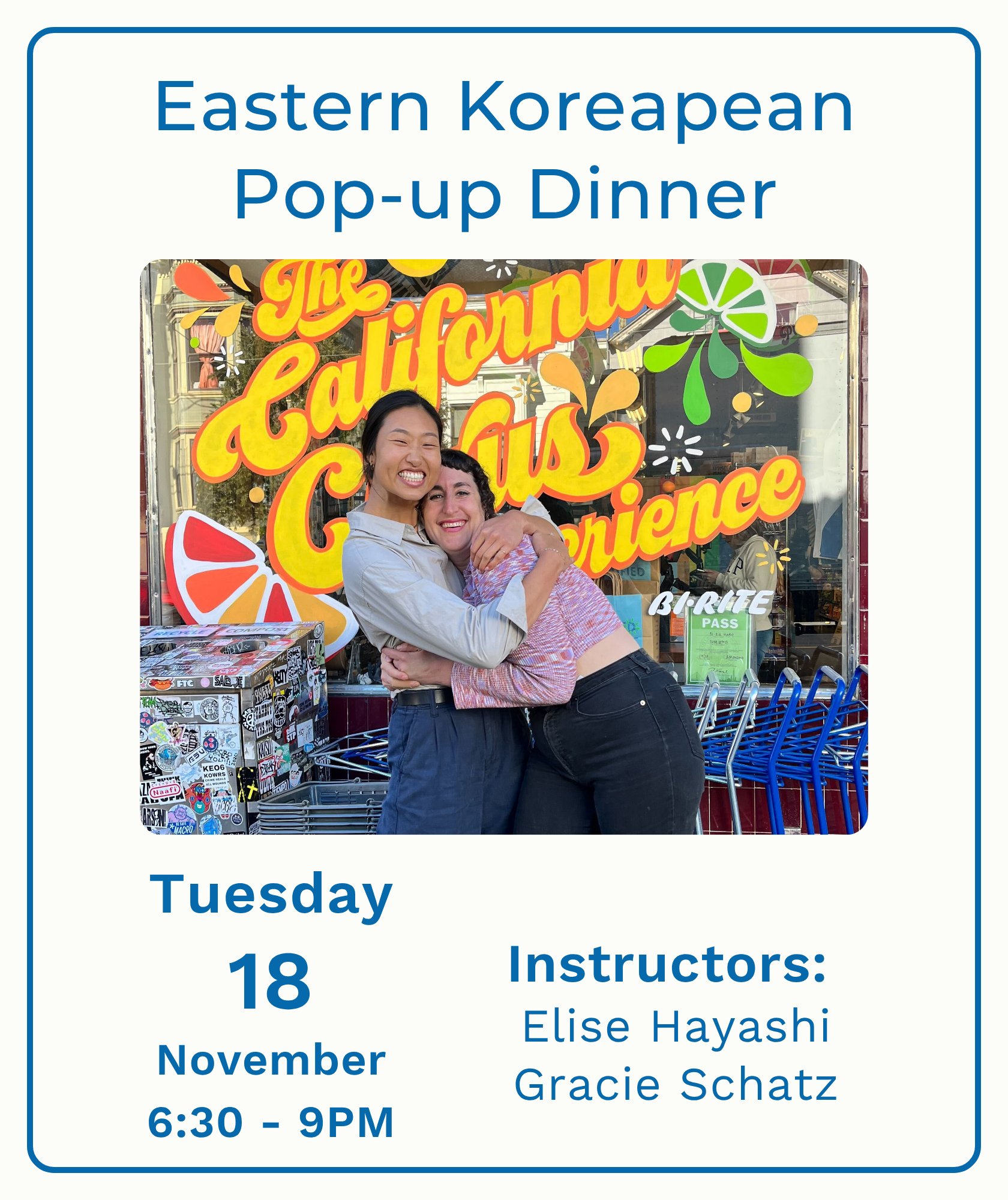 Chefs Gracie and Elise are collaborating on a pop up dinner!!! This meal celebrates their shared love of bold, seasonal, and beautiful foods and their menu features the best of both of their respective cuisines - Eastern European and Korean. You can expect to indulge in copious varieties of fermented and pickled delights, rich hearty broths, dumplings, crispy pancakes and more! While working together at 18 Reasons, Gracie and Elise realized that cooking was their favorite way to show love. This meal is their opportunity to share that love with you and to express the love and inspiration they feel towards each other. The result? A playful, heartfelt feast you’ve likely never experienced before and may never see again. Eastern Koreapean cuisine might not be a real thing (yet!), but for one night, it will be. So come on, let us shower you in unique, unforgettable delicacies! What are you waiting for!?