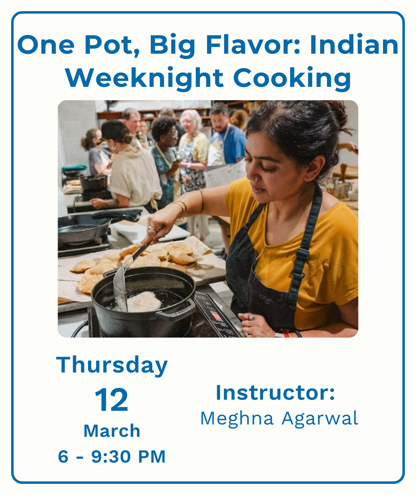 Comfort, ease, and the joy of a good meal can happen at the end of a long day! Indian food can feel intimidating, but it doesn’t have to be. In this hands-on class, you’ll learn how to make deeply flavorful Indian dishes using simple techniques and just one pot—perfect for relaxed weeknight cooking.