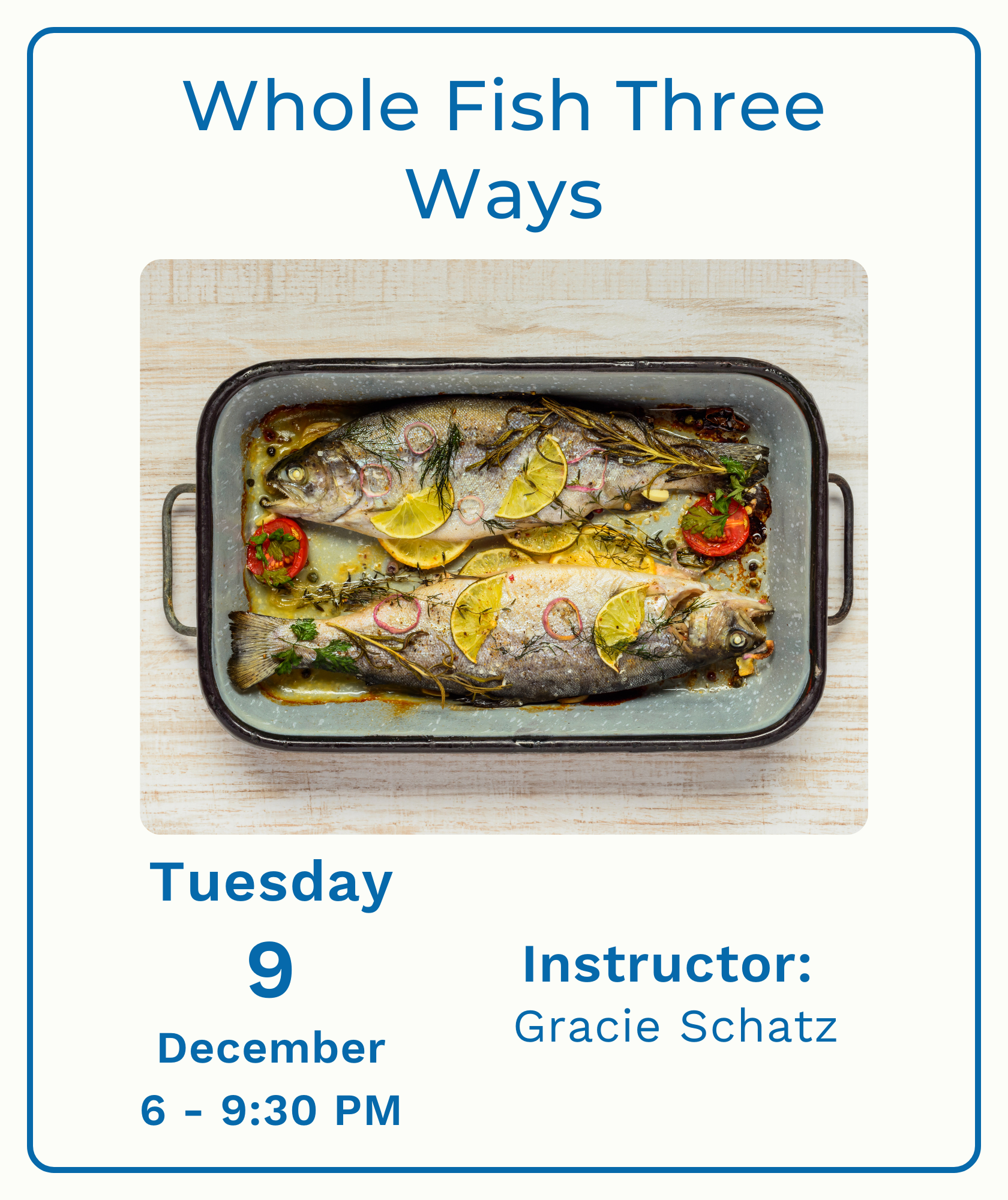 A whole fish is a showstopping centerpiece to a holiday meal or really any meal! Knowing how to confidently season, adorn, roast, pan sear, and serve a whole fish is a wonderful skill to tuck into your back pocket and pull out whenever you want to impress your friends and family. In this class, we will use three different techniques, ranging from beginner to advanced, to lovingly and carefully roast and serve three different whole fish.